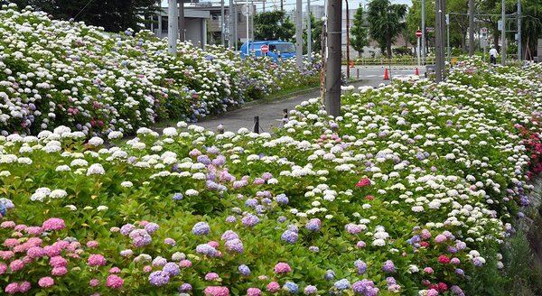 京都市中心,雨中,祇園祭和喜祭的山鉾遊行隊伍。懸掛的物品是乙烯基材質的,許多雨傘都撐開著,旁邊傳來陣陣歡呼聲。