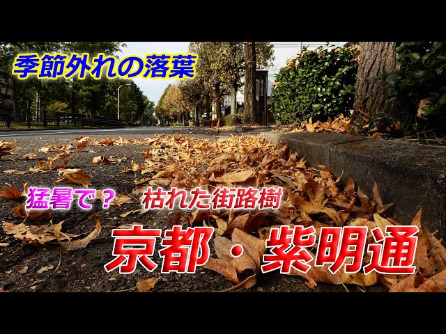 【4K動画】京都市北区の紫明通沿いにある街路樹で、季節外れの落葉が目立っている。紅葉の季節にはまだ早い中、木々には茶色に枯れた葉が目立ち、落葉が道路や歩道に広がっている。近くの住民によると、この夏の猛暑の影響からか、9月中旬から枯れ葉が目立ち始めたといい、雨樋や側溝に詰まるなどの影響も出ているという。