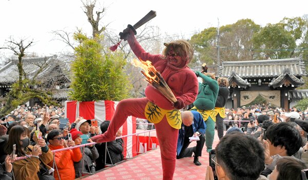 A little after 3pm, a goma fire was lit in the temple grounds and the prayer began. As drums and conch shells rang out, a red demon carrying a torch and sword, a blue demon carrying an axe, and a black demon holding a hammer appeared in slow movements. The demons went onto a special stage adjacent to the temple and brandished their swords and other weapons before entering the hall and dancing around the monks. However, they gradually became weaker due to the power of the ritual and fled in agony.