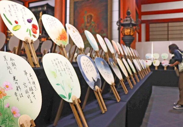 The "Toji Literary Fan Exhibition: Cool Words 2025" is being held at the World Heritage Site Toji Temple in Kyoto's Minami Ward until September 21, 2025. This exhibition features approximately 280 works by haiku, tanka, senryu, and gogyo-ka enthusiasts from across Japan, along with matching illustrations hand-painted on fans by calligraphers and artists. They provide a refreshing feeling to visitors amid the lingering heat of summer.