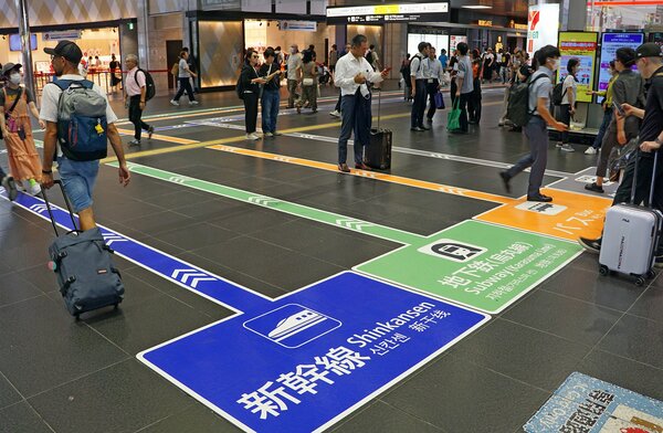 Kyoto City, JR West, and others are installing new transfer guide signs on the floors of Kyoto Station and along the North-South Passageway. Making destinations clear at a glance will alleviate congestion caused by concentrated tourists and promote smoother travel.