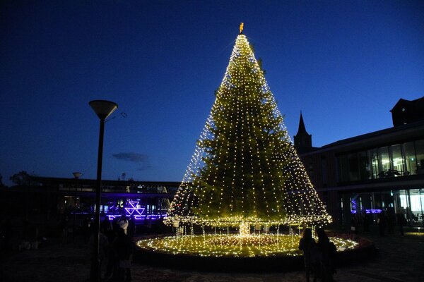 A Christmas tree lighting ceremony was recently held at Doshisha Women's College of Liberal Arts' Kyotanabe Campus in Kodo, Kyotanabe City, Kyoto Prefecture. The approximately 12-meter-tall tree was decorated with 5,489 LED bulbs. As the sun set, a warm orange glow enveloped the area.