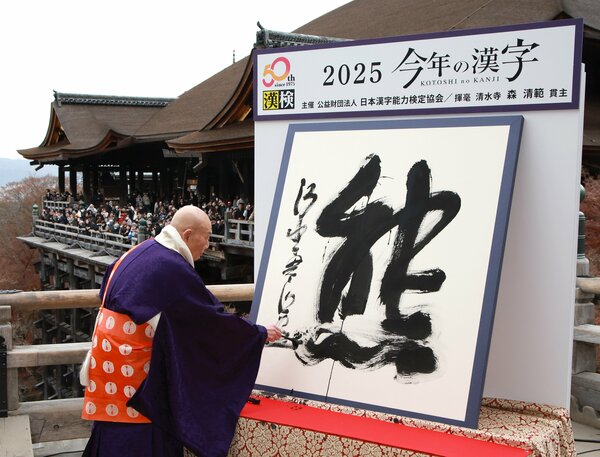 "Kuma" (bear) has been chosen as the kanji of the year, representing the state of the world. The Japan Kanji Aptitude Testing Foundation (Higashiyama Ward, Kyoto City) announced the selection on December 12, 2025, at Kiyomizu-dera Temple, a World Heritage Site in Higashiyama Ward, Kyoto City. The calligraphy was written by the temple's abbot, Mori Seihan.
