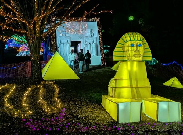 Walking through the venue, visitors will notice the gleaming golden Egyptian sphinx, pyramids, and giant snake. After passing through a recreated ancient temple, visitors will enter the zone where colorful dinosaurs await. Visitors can climb into the driver's seat of a dinosaur truck or step inside a dinosaur's gaping mouth for photo opportunities.