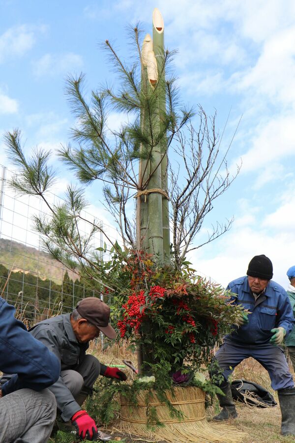 A pair of 4-meter-tall jumbo kadomatsu (Japanese traditional New Year's decorations) were unveiled on December 7, 2025, on the San'in-Oe Prefectural Road in Naomi, Yakuno-cho, Fukuchiyama City, Kyoto Prefecture. This year, the kadomatsu will once again welcome visitors at the entrance to the village as part of the local farming association's annual preparations for welcoming the New Year.