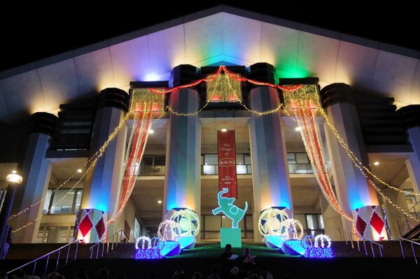 At Kyoto University of the Arts in Kitashirakawa, Sakyo Ward, Kyoto City, a 36-meter-wide illumination display adorns the grand staircase along Shirakawa-dori Street, and is lit up every night. This traditional event is planned by students, and this year's design was circus-themed. 13,000 light bulbs create images of elephants performing ball-balancing feats.
