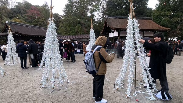 At Kamigamo Shrine (a World Heritage Site) in Kyoto's Kita Ward, worshippers lined up in long lines, clasping their hands together in the main hall and making New Year's resolutions, praying for happiness in the coming year. A 28-year-old office worker visiting with a friend from Osaka's Kita Ward said, "It was sunny when we left that morning, so I was surprised (to see the snow). We came here to pray for happiness in the coming year," as she took commemorative photos within the shrine grounds.