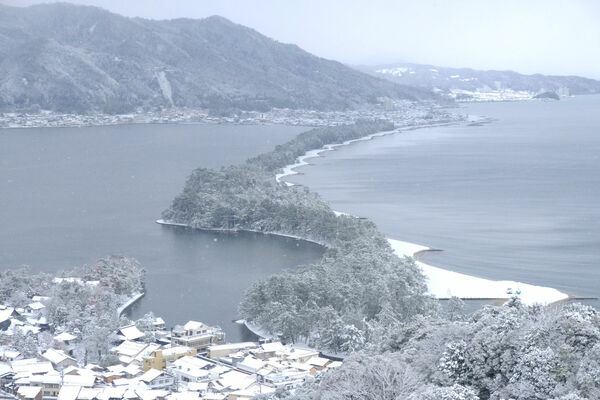 At Amanohashidate View Land, an observation amusement park in Monju, Miyazu City, where you can enjoy the view of Amanohashidate, one of Japan's Three Most Scenic Views, tourists gazed upon the fantastical snow-covered pine trees and sandy beach of Amanohashidate, capturing them on camera.
