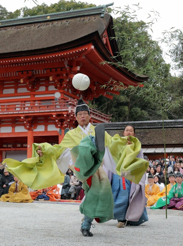 On January 4, 2026, Shimogamo Shrine in Kyoto's Sakyo Ward held its annual "Kemari Hajime" (first kemari game). The sight of colorfully attired worshippers kicking balls into the New Year's sky drew cheers from worshippers on their first visit of the year.