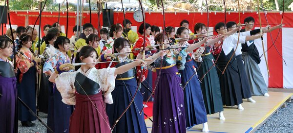 A female second-year student at Doshisha University (20 years old) said with a smile, "Ever since I started Kyudo, it has been my goal to stand here. I drew my bow with gratitude to my family and friends who have supported me up until now."