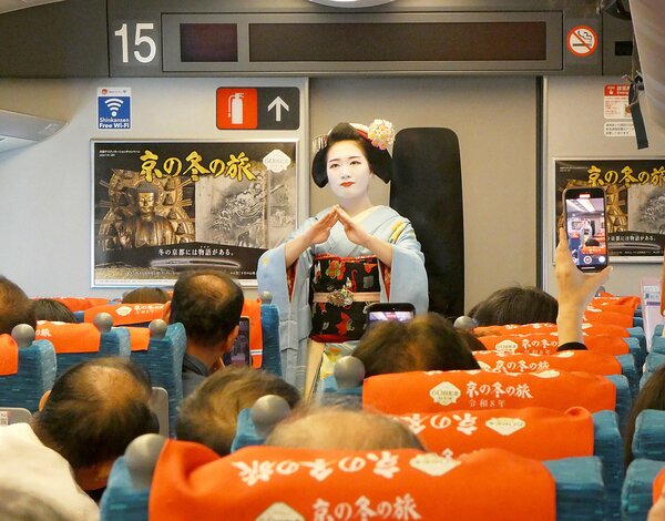 On January 23, 2026, a special stage was set up inside the Tokaido Shinkansen train, where a Kyoto geisha and maiko danced and performed kyogen plays aboard a Nozomi super express train bound for Shin-Osaka. Geisha and maiko greeted passengers at Tokyo Station, creating a Kyoto atmosphere inside the shinkansen.