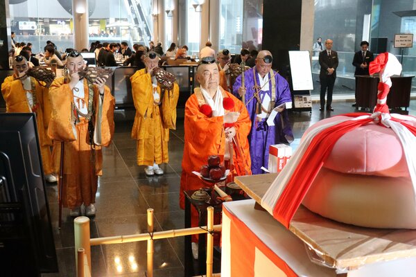 Ahead of the annual "Godairikison Nio-e" event to be held at Daigoji Temple (Fushimi Ward, Kyoto City) on February 23, 2026, an exhibition of giant kagami mochi (rice cakes) the same size as those used in the event opened on February 11 at Hotel Granvia Kyoto (Shimogyo Ward, Kyoto City). Monks dressed as mountain ascetics performed a spirit-infusing ceremony and prayed for people's happiness.