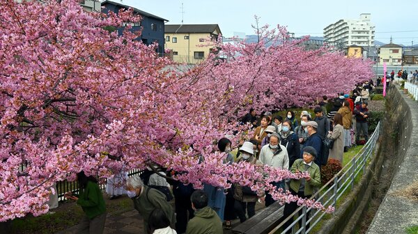 In the Yodo area of Kyoto City's Fushimi Ward, the early-blooming Kawazu cherry trees planted along the waterways are in full bloom. Despite a chilly morning, the weather gradually cleared on March 6, 2026, as tourists enjoyed the early arrival of spring.