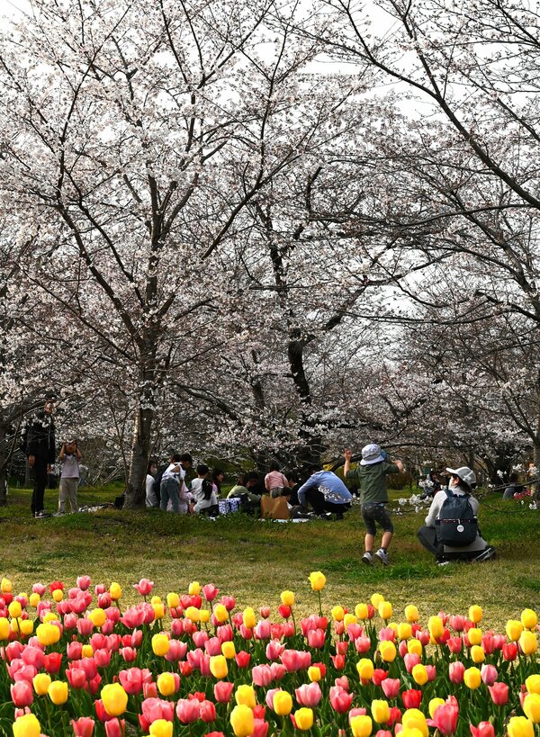 At the Kyoto Prefectural Botanical Garden in Sakyo Ward, Kyoto City, various types of cherry blossoms, including Somei Yoshino and weeping cherry trees, are reaching their peak bloom. They are adorning the garden, competing with tulips, which are also in full bloom. On March 28, 2026, a warm day with temperatures exceeding 20 degrees Celsius, foreign tourists and families visited the garden, spreading out plastic sheets and enjoying "hanami" (cherry blossom viewing).