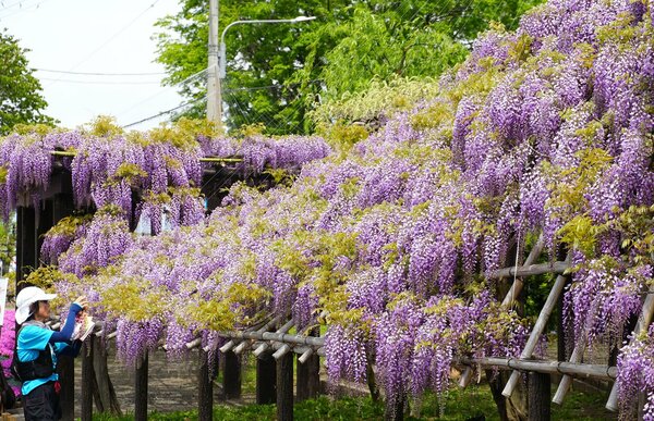 The event is held annually by the Kyoto City Waterworks Bureau with the aim of deepening understanding of waterworks and sewage systems. Approximately 40 wisteria bushes of three varieties—long wisteria, white wisteria, and white wisteria—are in full bloom. The flowers are about 80-90% in bloom and are expected to reach full bloom this weekend.