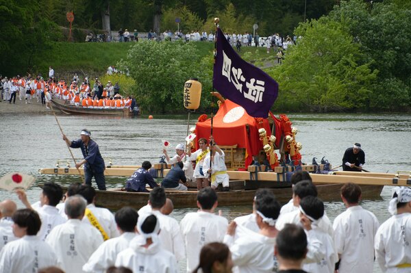 The traditional Shinkosai festival of Matsuo Taisha Shrine (Nishikyo Ward, Kyoto City) was held on April 26, 2026, in Nishikyo Ward, Ukyo Ward, and other areas of Kyoto City. Six portable shrines (mikoshi) crossed the Katsura River by boat in a magnificent "boat procession" (funatogyo), with the shrine bearers shouting energetically, drawing large crowds of spectators.