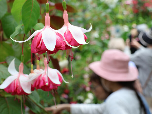 Fuchsias are trees distributed mainly in the high-altitude regions of Central and South America. The garden is displaying over 200 pots of approximately 180 varieties, including slender tubular and plump double-flowered types, each producing flowers about 10 centimeters in diameter.