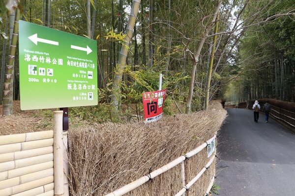 Mukō City in Kyoto Prefecture has added tourist information signs at seven locations along the popular "Bamboo Path," a walking trail known for its bamboo groves and fences. The signs now display information such as the time required to reach the nearest station and the location of restrooms, accompanied by pictograms. This aims to prevent foreign tourists from getting lost and enhance the trail's appeal.