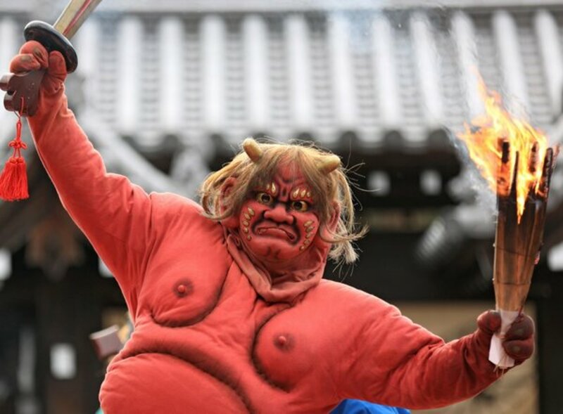 At the Rosanji Temple in Kamigyo Ward, Kyoto City, the "Tsuinashiki Onihoraku" ritual is held to pray for protection from misfortune and good fortune. Three demons, symbolizing the worldly desires of humans, are driven away. February 3, 2026